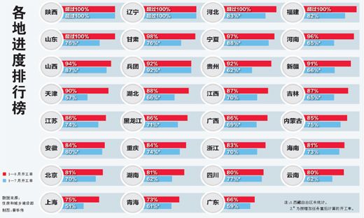 其中,开工率超过100%的有5省,分别是河北、辽宁、福建、山东、陕西。此外,还有14个地方开工率超过全国平均水平或与全国平均水平持平,分别是:甘肃98%、宁夏97%、河南96%、山西94%、贵州92%、新疆生产建设兵团92%、新疆维吾尔自治区91%、天津90%、湖北88%、吉林87%、江西87%、黑龙江86%、江苏86%、广西86%。