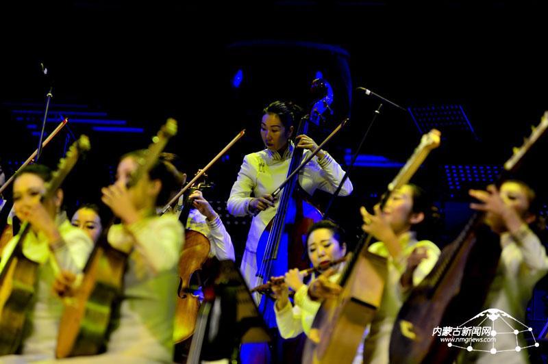 乐手们正在激情合奏乐曲《丝路驼铃》。7月2日,《北疆天籁——民族管弦乐音乐会》在乌兰恰特大剧院上演。内蒙古日报社融媒体记者 王晓博 摄