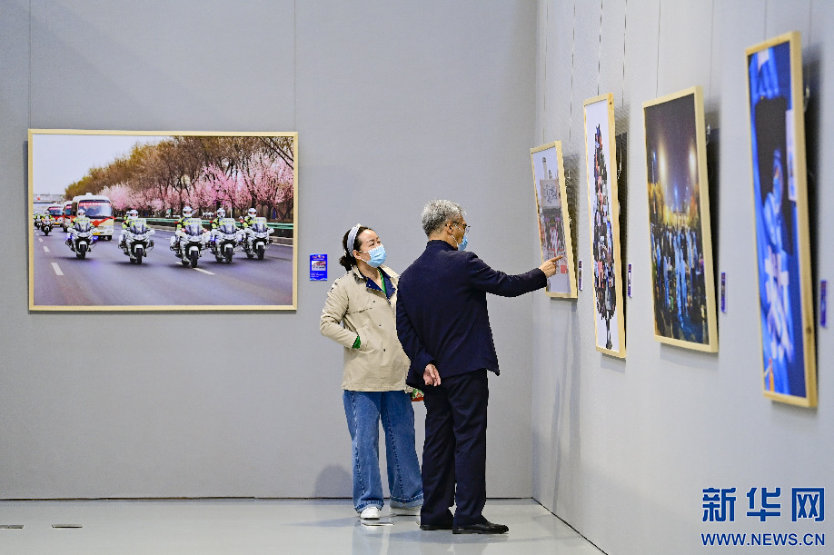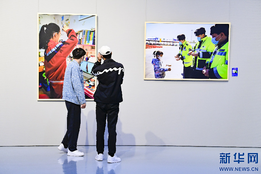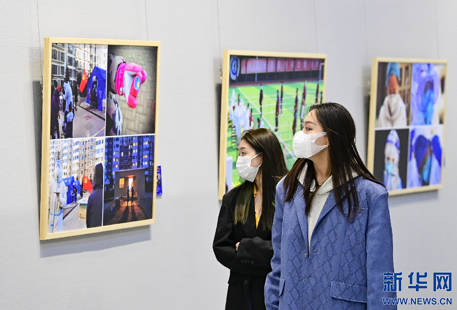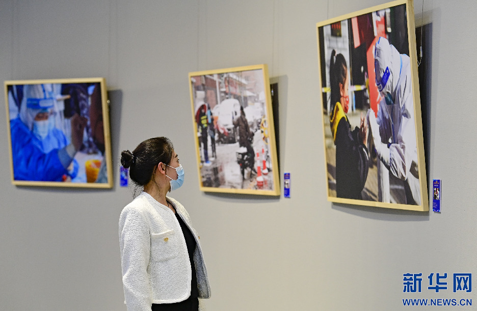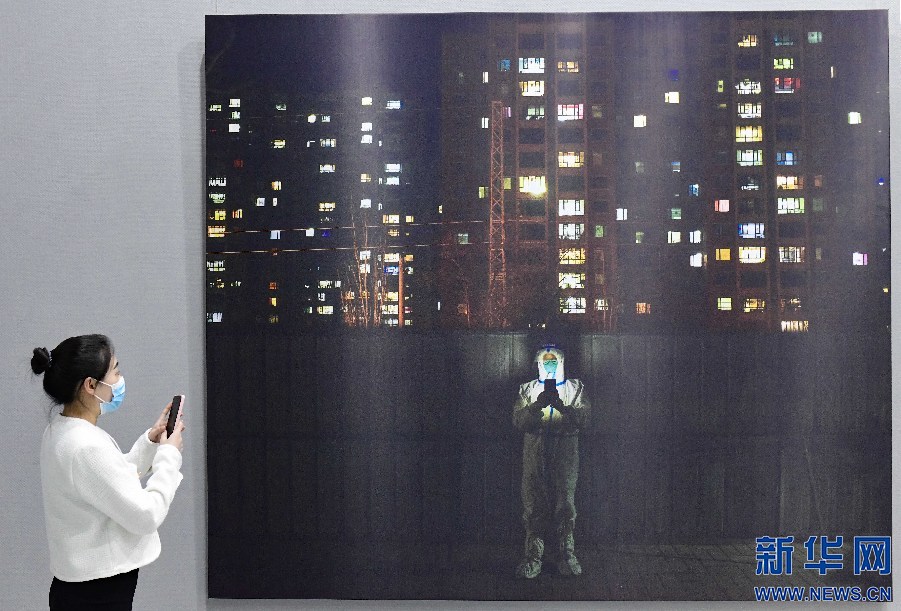 4月29日,观众在内蒙古美术馆观赏抗击疫情摄影作品展。新华网发(王正摄)