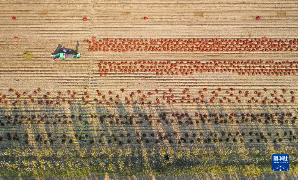 10月25日,在开鲁县东风镇东方红村,村民在田间收获红干椒(无人机照片)。新华社记者 连振 摄