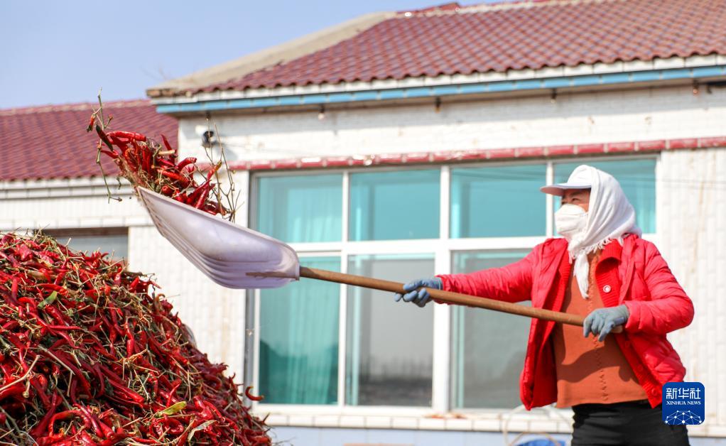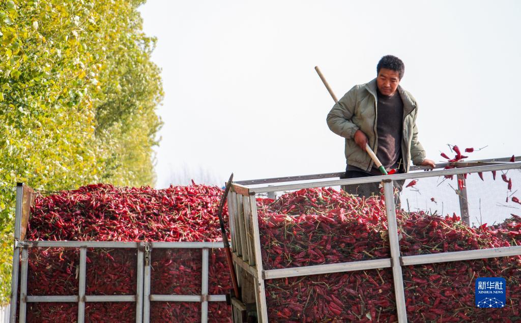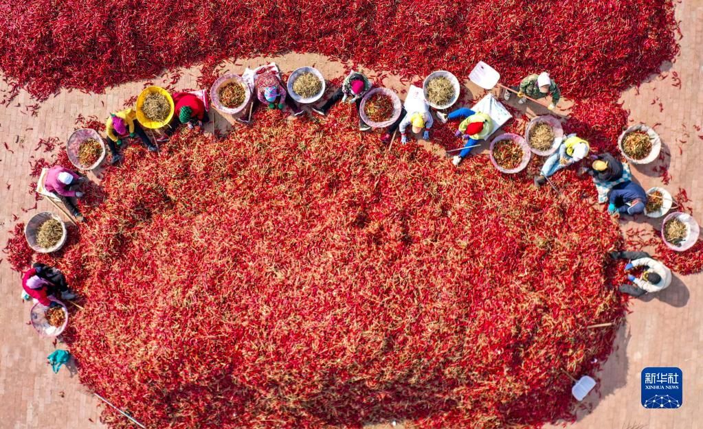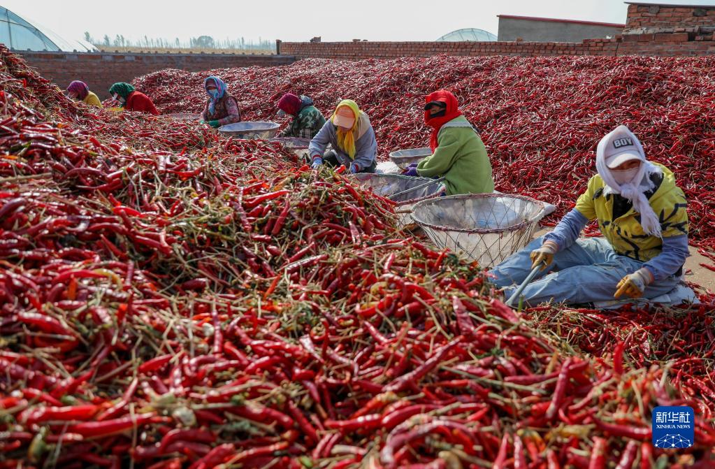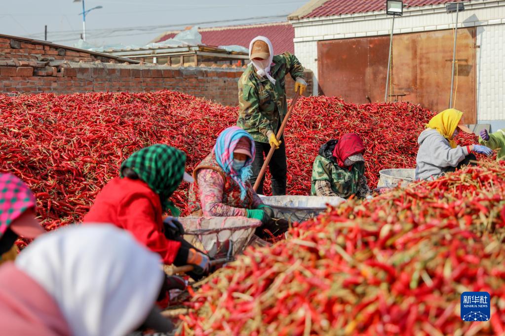 近日,内蒙古通辽市开鲁县迎来红干椒收获销售旺季。开鲁县红干椒皮红肉厚、品质优良,产品畅销国内外市场。近年来,开鲁县红干椒种植面积稳定在60万亩。新华社记者 连振 摄