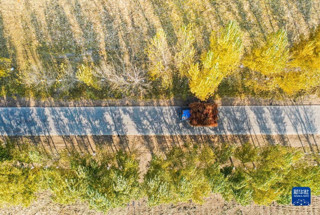 10月25日,在开鲁县东风镇东方红村,村民运输收获的红干椒(无人机照片)。新华社记者 连振 摄