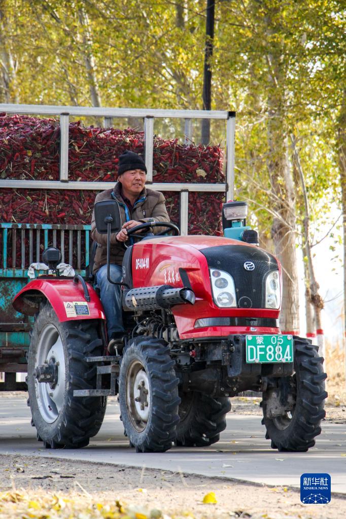 10月25日,在开鲁县东风镇东方红村,村民驾驶拖拉机运输红干椒。新华社记者 连振 摄