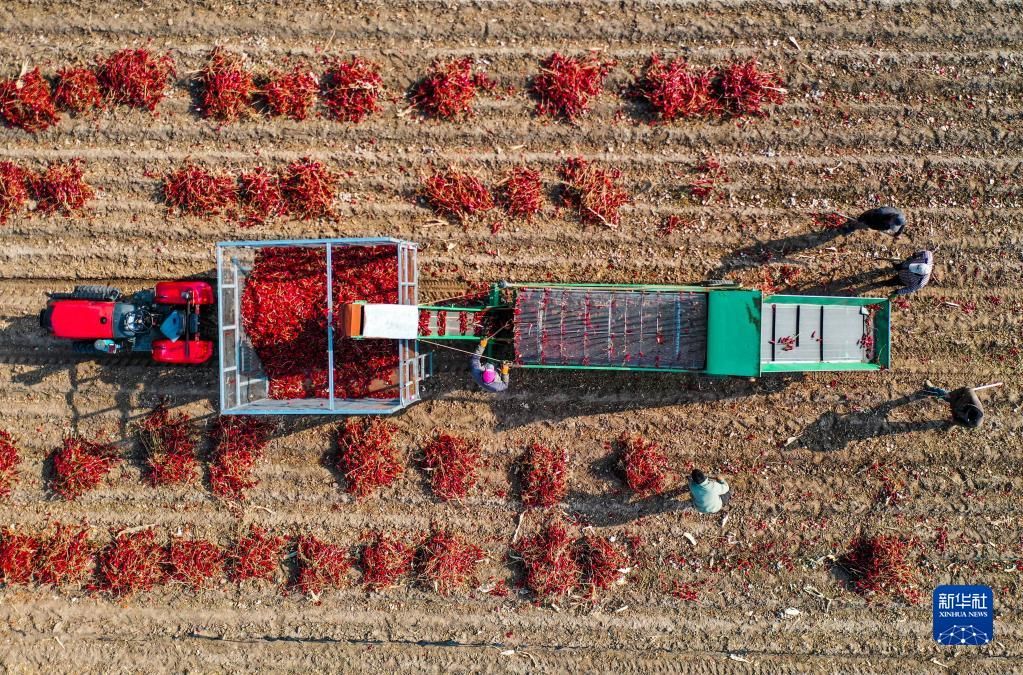 10月25日,在开鲁县东风镇,工作人员驾驶铲车收获晾晒好的红干椒(无人机照片)。新华社记者 连振 摄