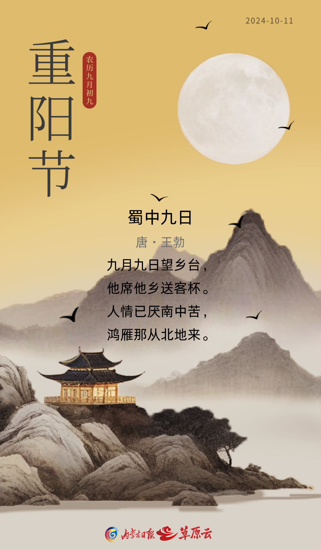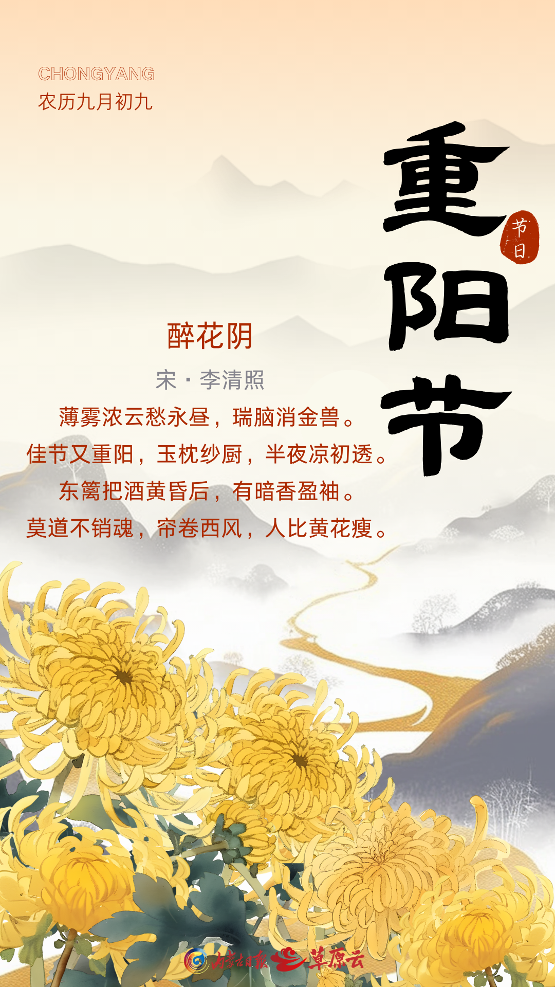 重阳,是落在故乡庭院的菊花瓣,是品味胜似春光之景的巡游,是遍插茱萸少一人的思念。此时,你身在故乡还是浪迹他乡?此刻,你把谁想起?将重阳这碗菊花酒一饮而尽,去解一首思绪浓得千年也化不开的诗——