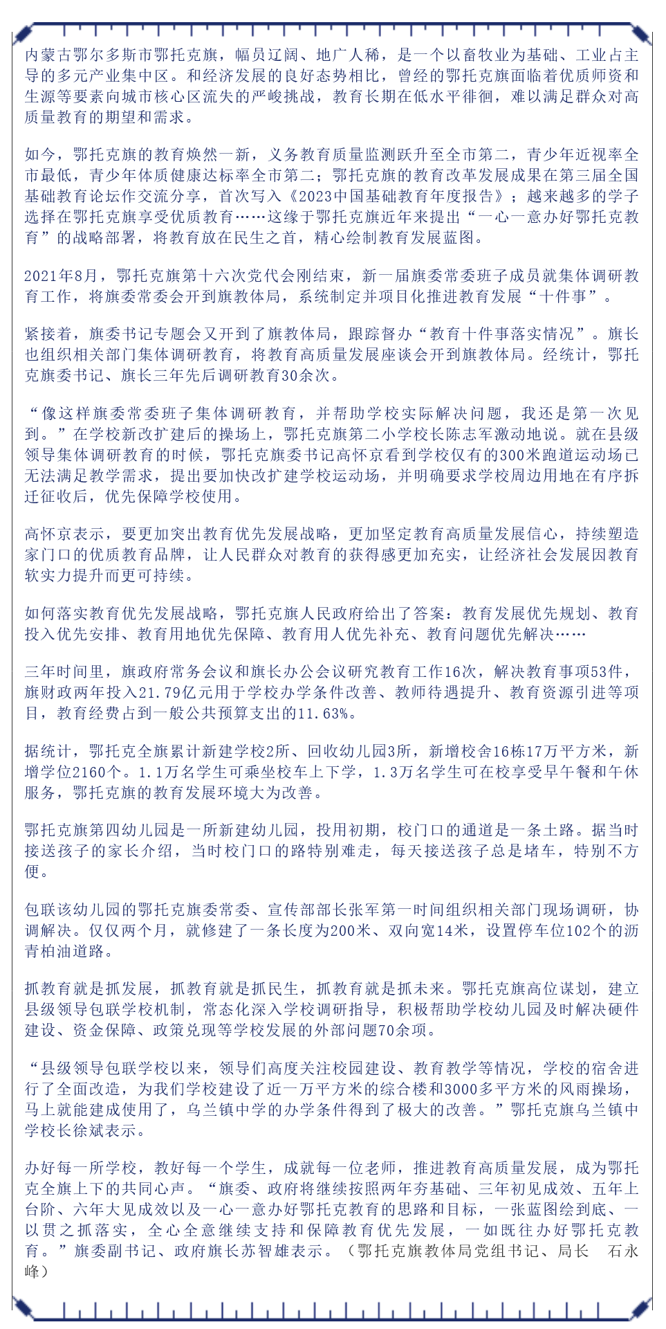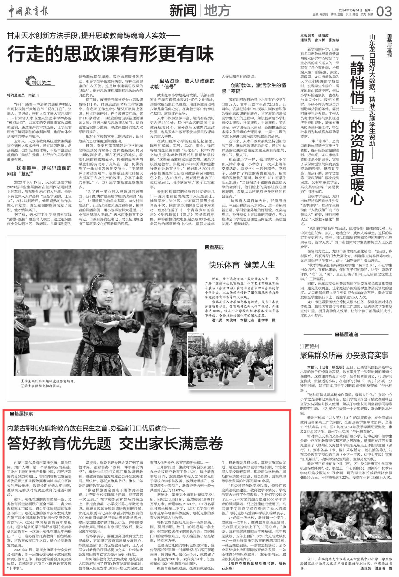 2024年10月14日,《中国教育报》第3版刊发题为《内蒙古鄂托克旗将教育放在民生之首,办强家门口优质教育—— 答好教育优先题 交出家长满意卷 》的文章,报道了鄂托克旗近年来提出“一心一意办好鄂托克教育”的战略部署,将教育放在民生之首,精心绘制教育发展蓝图。