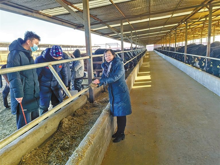 内蒙古农业大学教授、呼和浩特市科技特派员闫素梅(右一)在种驴养殖基地调研。