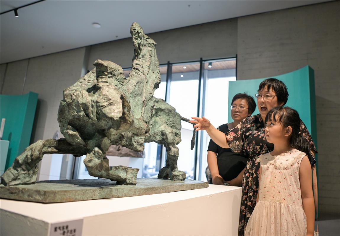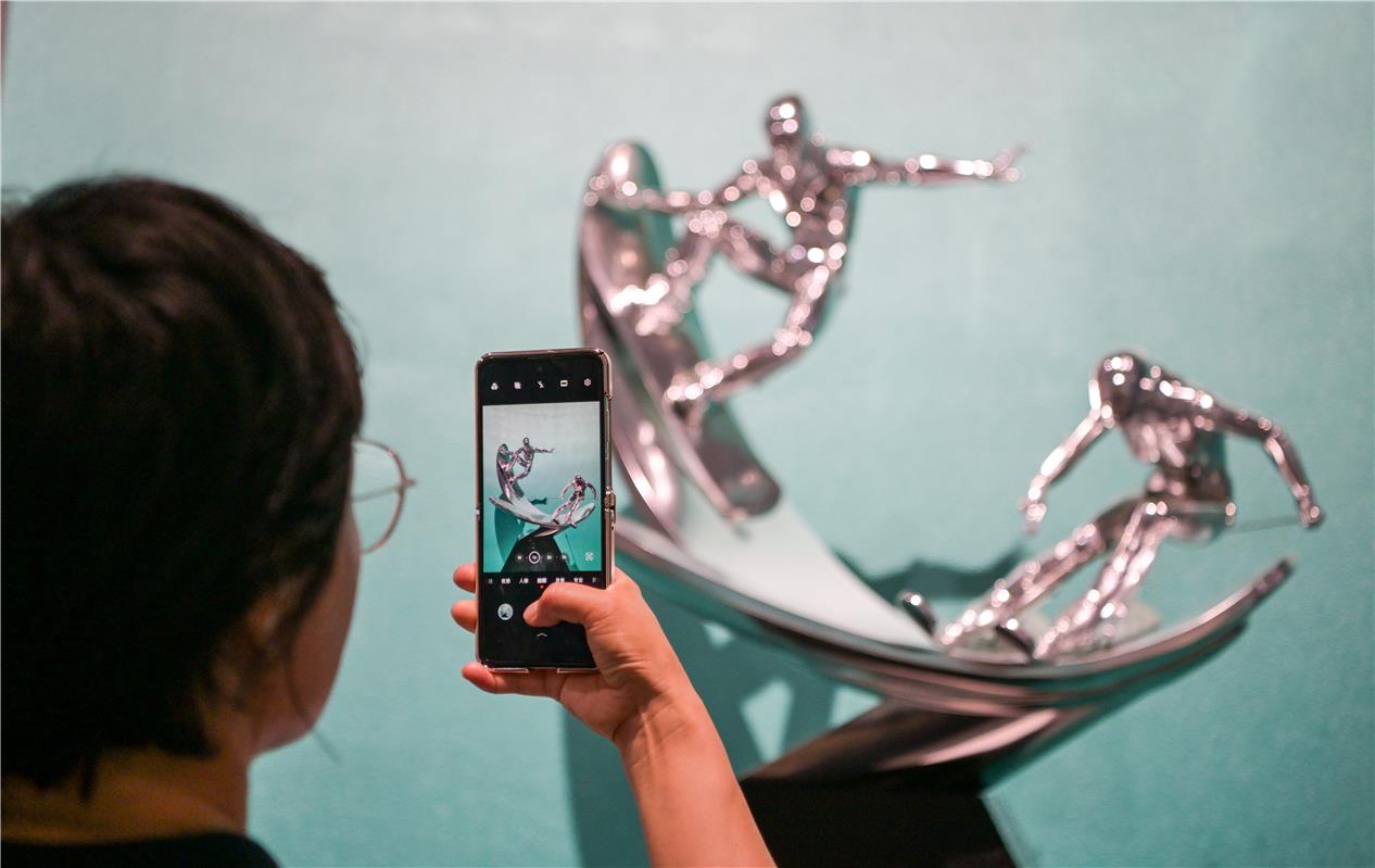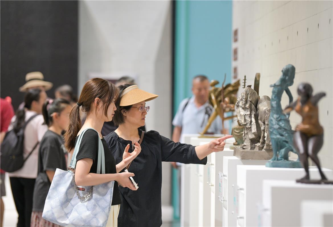 8月3日,呼和浩特市民观看雕塑艺术展。