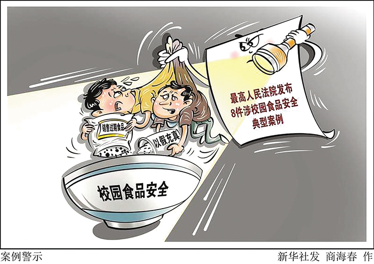 校园食品安全关乎孩子健康成长,然而一些不法分子动了歪脑筋,从校园餐里“夺食”。近日,最高人民法院发布8件涉校园食品安全典型案例,以案释法,震慑涉校园食品安全违法犯罪,保障广大师生身体健康和生命安全。 新华社发 商海春 作