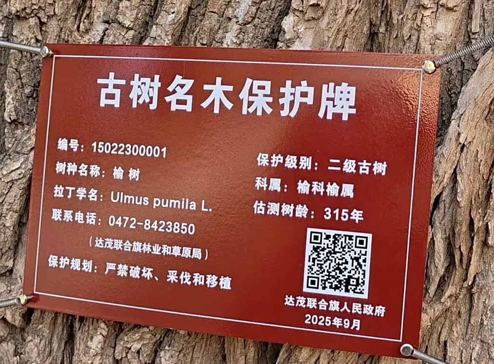 每块古树名木保护牌都标注了中文名、拉丁名、科属等信息,扫描二维码即可查看古树“成长档案”,树木的基本信息、位置信息、树龄与保护等级等一目了然。近日,达茂旗林草局为巴音敖包苏木达布希拉图嘎查和巴音宝力格嘎查大海林树的7株见证岁月的古树挂牌,其中一株古榆树树龄长达315年。