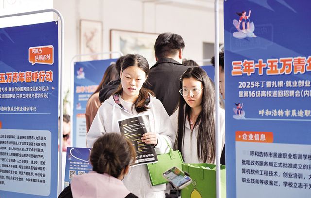 10月12日,求职者在招聘会上向心仪企业认真询问岗位要求。当日,2025年呼和浩特市丁香扎根·就业创业服务进校园系列活动走进内蒙古鸿德文理学院,60家企业提供2068个就业岗位。今年呼和浩特市已举办各类校园专场招聘会16场,入校送岗4.6万个,服务高校学子3万余人。草原云·内蒙古新闻网记者 杨林枝 摄