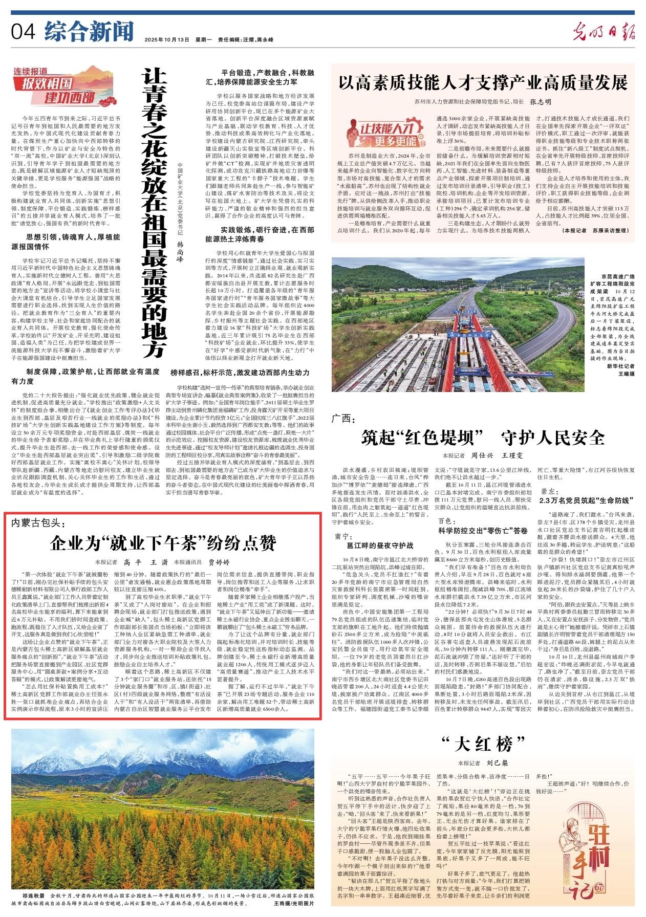 2025年10月13日《光明日报》第4版刊发了《内蒙古包头:企业为“就业下午茶”纷纷点赞》的文章,报道了内蒙古包头稀土高新区为破解基层就业服务痛点而“创新招”。将“就业下午茶”活动直接搬到产业园区、社区党群服务中心,用“圆桌茶叙+案例分享+互动答疑”的模式,让政策解读更接地气。