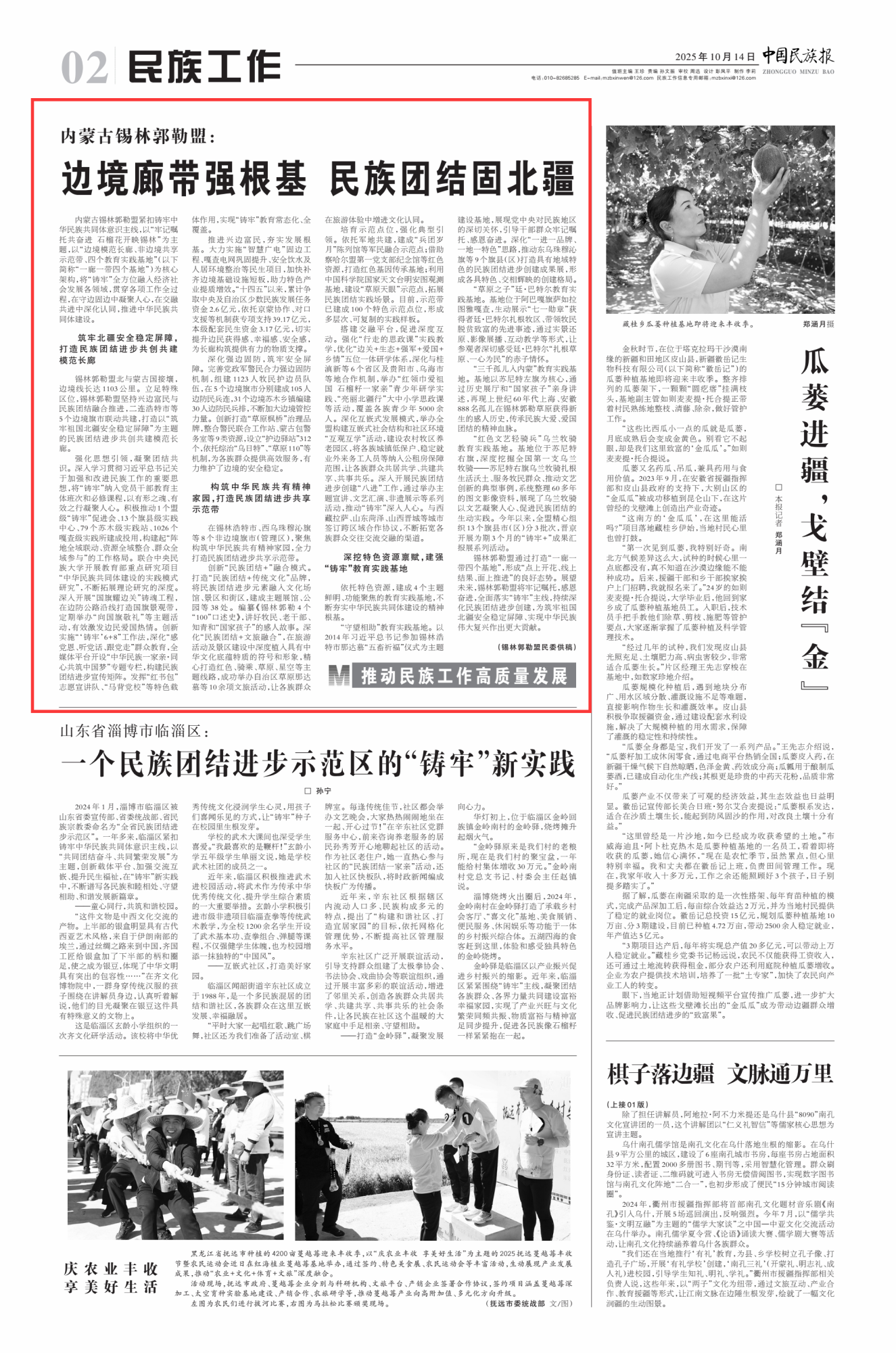 2025年10月14日,《中国民族报》第2版刊发题为《内蒙古锡林郭勒盟:边境廊带强根基 民族团结固北疆》的文章,报道了内蒙古锡林郭勒盟紧扣铸牢中华民族共同体意识主线,以“牢记嘱托共奋进 石榴花开映锡林”为主题,以“边境模范长廊、非边境共享示范带、四个教育实践基地”(以下简称“一廊一带四个基地”)为核心架构,将“铸牢”全方位融入经济社会发展各领域,贯穿各项工作全过程,在守边固边中凝聚人心,在交融共进中深化认同,推进中华民族共同体建设。