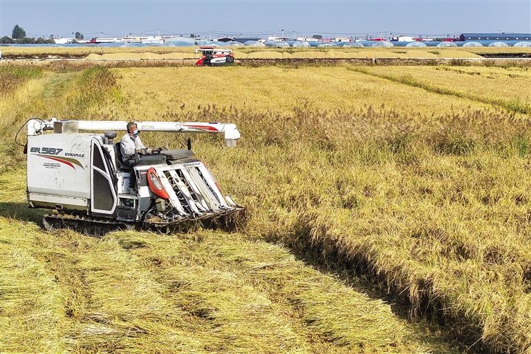 10月15日,在鄂尔多斯市达拉特旗昭君镇沙圪堵村,种植户驾驶收割机抢收水稻。当前,内蒙古的秋收工作进入高峰期,整体进度已超越八成,预计秋收工作将在11月初全部完成。草原云·内蒙古新闻网记者 王晓博 摄