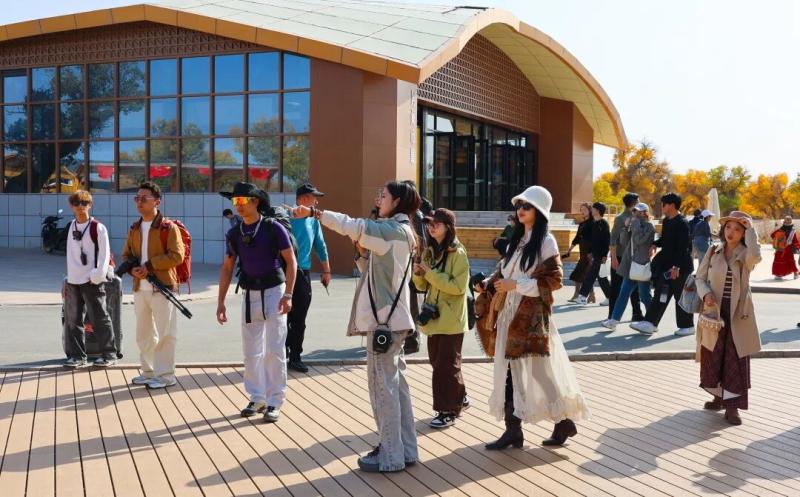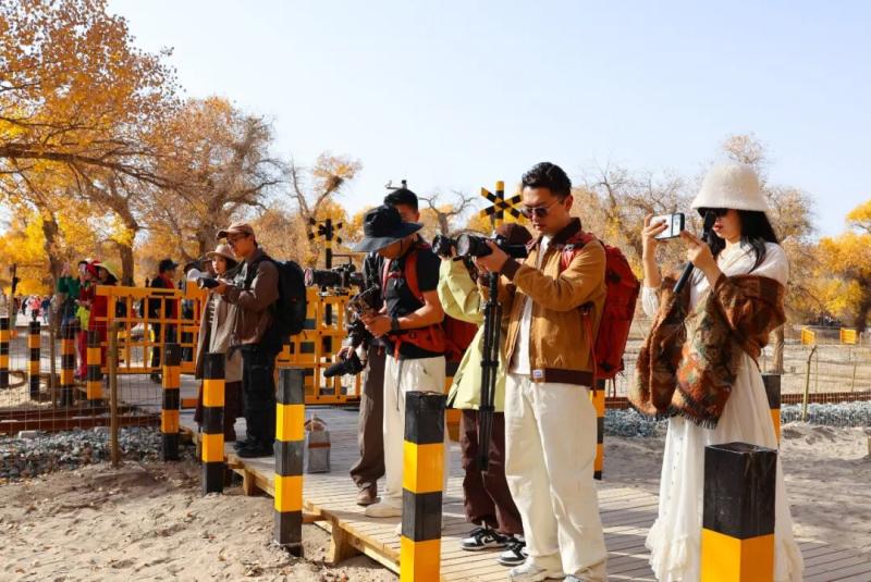 在额济纳胡杨林旅游区,达人们漫步金色胡杨林,搭乘小火车感受额济纳独特的秋日浪漫。大家拿出设备,从各角度记录下独特的美景,向网友和粉丝推介胡杨林的绝美风光。