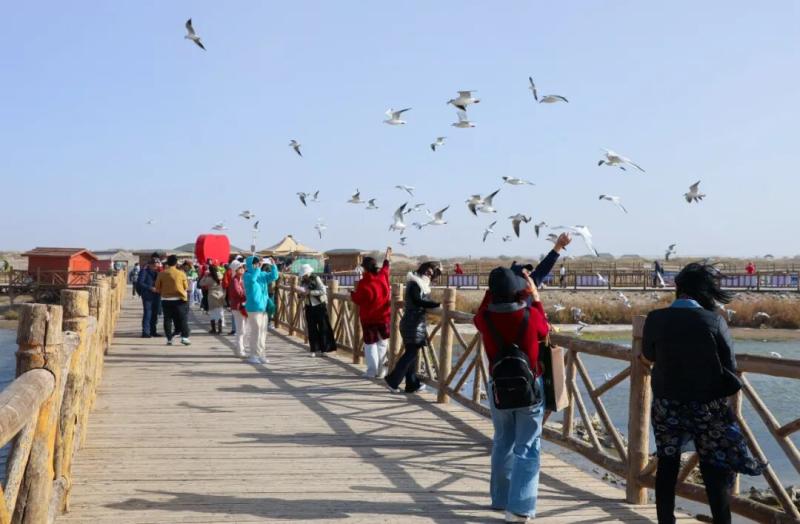 在居延海景区,达人团队参观了居延海生态建设展览馆,系统了解居延海生态保护成效,他们乘船近距离观赏湖光景色,体验投喂海鸥的乐趣。