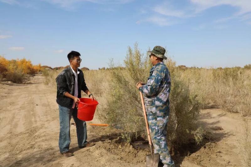 在苏和造林基地,达人团队参与浇灌梭梭的实践活动,切身感受防沙治沙工作的艰辛与对生态保护的重要意义。