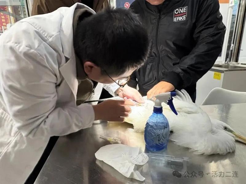 为防止二次伤害,工作人员立即将白鹭带回救治点,实施全面检查并开展紧急救护,通过静脉输液补充电解质与营养,同时为其搭建安静舒适的临时栖息环境,助其恢复体力。