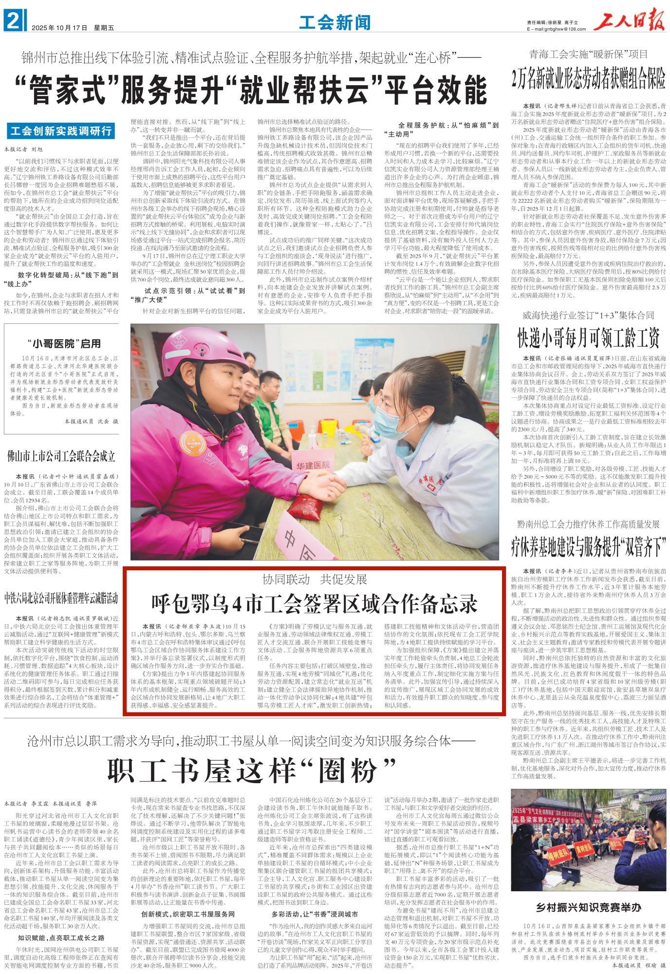 2025年10月17日,《工人日报》第2版刊发题为《协同联动 共促发展 呼包鄂乌4市工会签署区域合作备忘录》的文章,报道了内蒙古呼和浩特、包头、鄂尔多斯、乌兰察布4市总工会在呼和浩特集体审议通过《呼包鄂乌工会区域合作协同服务体系建设工作方案》,并举行备忘录签署仪式,以制度形式明确区域合作服务方向,进一步夯实合作基础。