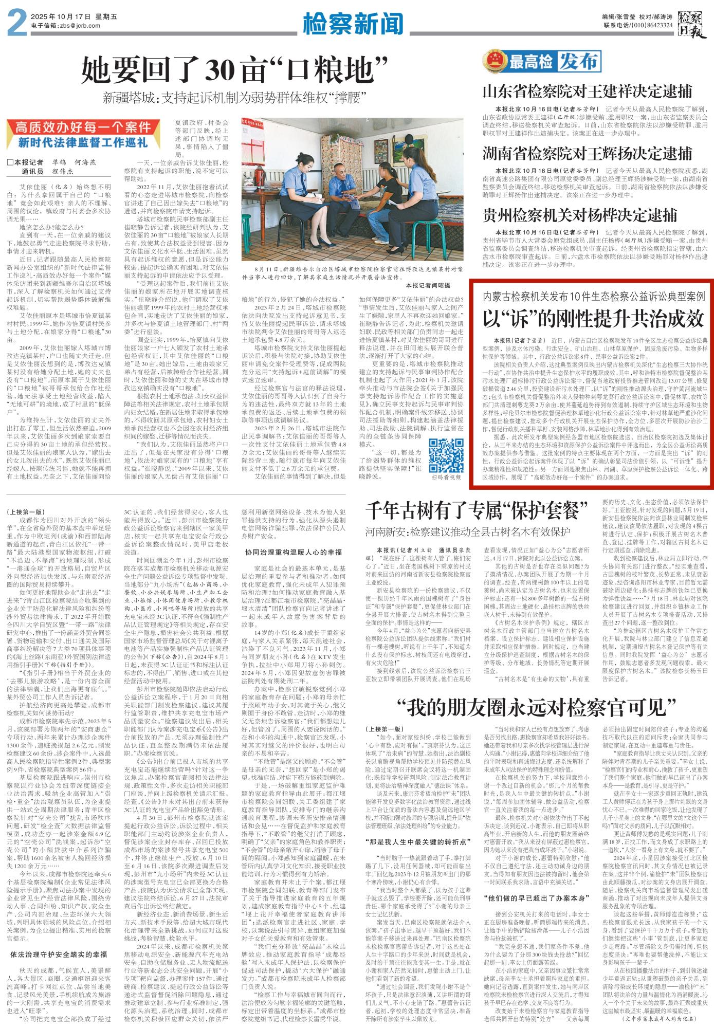 2025年10月17日,《检察日报》第2版刊发题为《内蒙古检察机关发布10件生态检察公益诉讼典型案例 以“诉”的刚性提升共治成效》的文章,报道了内蒙古自治区检察院发布10件全区生态检察公益诉讼典型案例,涉及水体污染、行洪安全、矿山治理、山林草原保护、固废危废污染、生物多样性保护等领域。