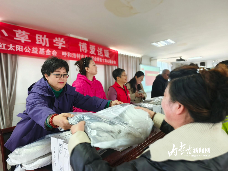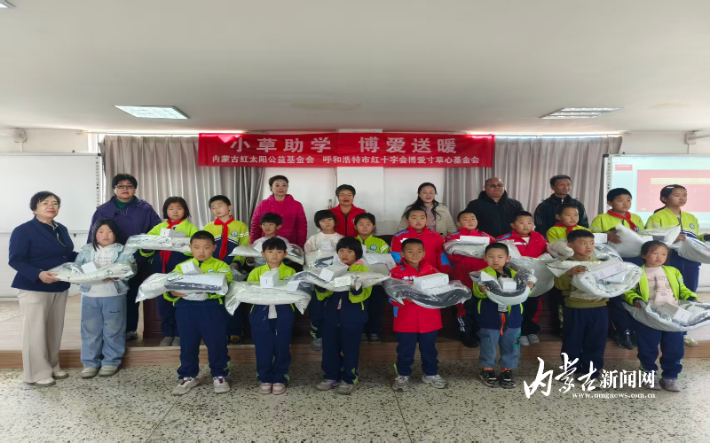 本网讯(草原云·内蒙古新闻网记者 王利军) 10月17日下午,呼和浩特市红十字会博爱寸草心基金会与内蒙古红太阳公益基金会携手在玉泉区牛场学校举办公益捐赠活动,为牛场学校、东二道河小学和达赖庄小学等3所小学的41名单亲困境学生送上“暖心包”,每套包含1件羽绒服、1套运动衣及1个水杯,助力孩子们健康成长。