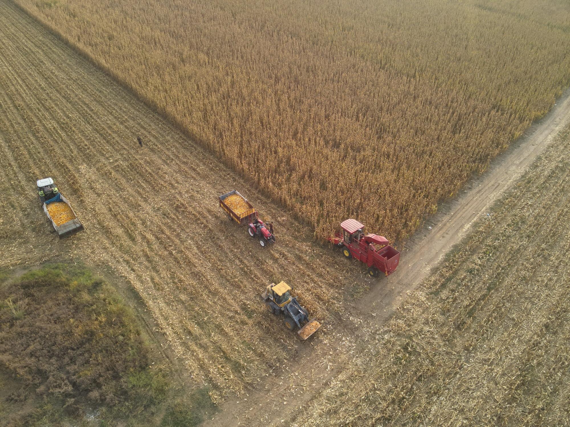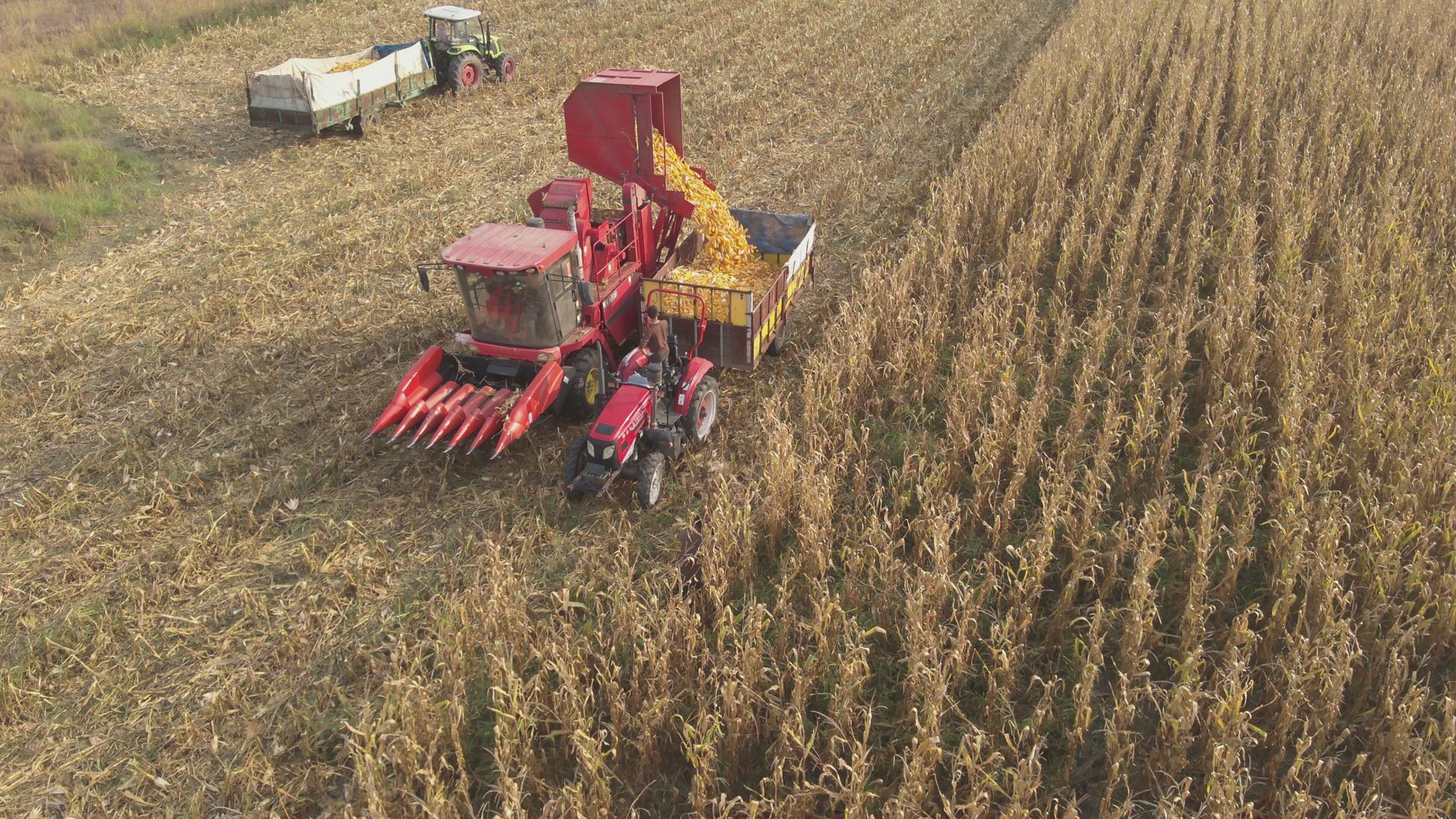 收割机在连片玉米地里作业。