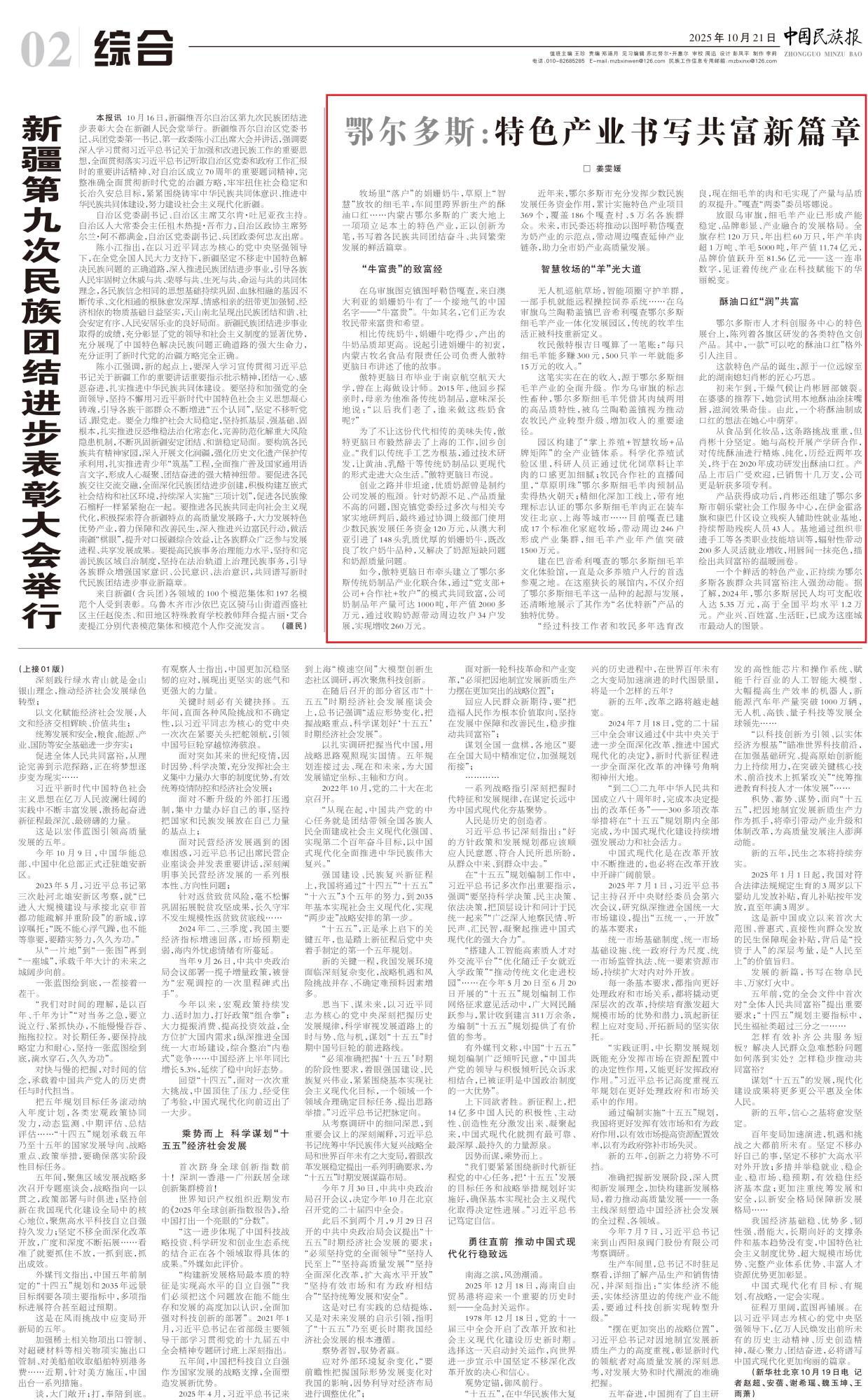 2025年10月21日,《中国民族报》第2版刊发题为《鄂尔多斯:特色产业书写共富新篇章》一文,报道了内蒙古鄂尔多斯的广袤大地上一项项立足本土的特色产业,正以创新为笔,书写着各民族共同团结奋斗、共同繁荣发展的鲜活篇章。据了解,2024年,鄂尔多斯居民人均可支配收入达5.35万元,高于全国平均水平1.2万元。产业兴、百姓富、生活旺,已成为这座城市最动人的图景。