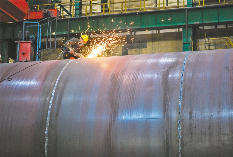 10月21日,在位于包头市的中国二冶集团钢构分公司生产车间,工作人员正在制作风力发电机塔筒。入秋以来,该公司吹响项目生产“冲锋号”,生产线满负荷运转,全力完成风机塔筒订单,保障新能源项目建设进度。