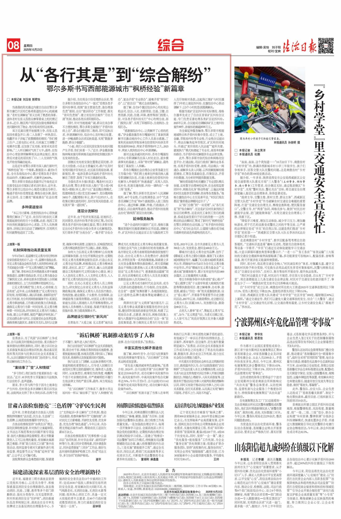 2025年10月23日,《法治日报》第8版刊发题为《从“各行其是”到“综合解纷”鄂尔多斯书写西部能源城市“枫桥经验”新篇章》的文章,报道了鄂尔多斯市以综治中心规范化建设为核心,深入践行新时代“枫桥经验”,通过多元举措化解矛盾纠纷,全力打造“暖城善治”社会治理品牌。截至9月底,全市各级综治中心累计受理各类矛盾纠纷22371件,化解率达96.03%。