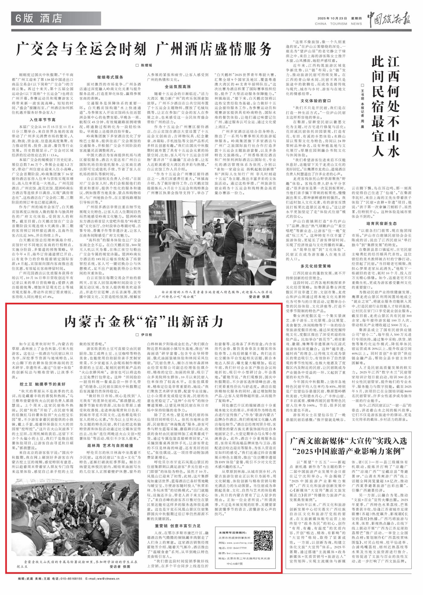 2025年10月23日《中国旅游报》第6版刊发了《内蒙古金秋“宿”出新活力》的文章,报道了秋日内蒙古,多地酒店与民宿凭借“住宿 + 体验”创新及精准营销打破淡旺季限制。