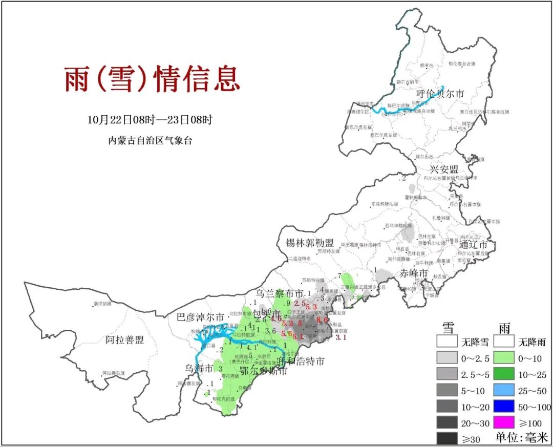 22日08时-23日08时,内蒙古7个盟市47个旗县的501个站点出现降水,降水主要出现在呼和浩特市、鄂尔多斯市、乌兰察布市,其中,乌兰察布市以雪为主。呼和浩特市城区最大降雨量为13.6毫米。