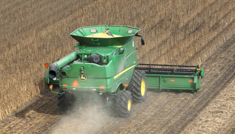 联合收割机在田间进行大豆机械化收割作业。摄影 郑明