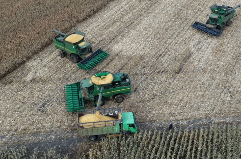 多台联合收割机在田间进行玉米机械化收割作业。摄影 王军