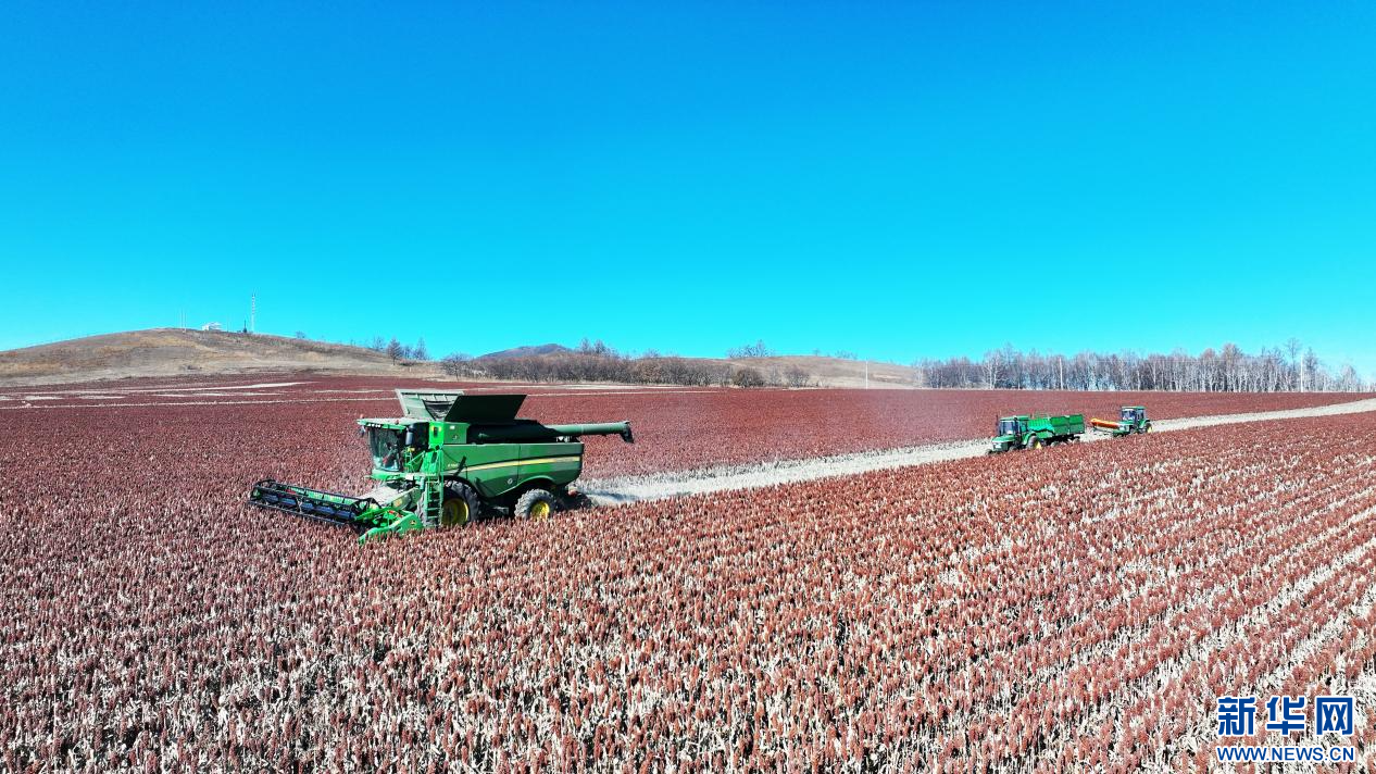 10月22日,在内蒙古自治区呼伦贝尔农垦绰尔河农牧场有限公司田间,农场员工正在收获高粱。新华网发(哈园硕 摄)