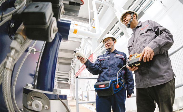 10月23日,在包头昆都仑经济技术开发区中博绿能智慧低碳能源岛项目区,工作人员正在进行设备检测。作为国内首个实现绿氢规模化应用于工业蒸汽供应的示范工程,该项目构建以全自动化天然气掺氢供能系统为核心的综合能源供给体系, 为园区企业提供高品质清洁能源,综合能效利用率高达99%以上,年减碳量超过50万吨。草原云·内蒙古新闻网记者 孟和朝鲁 摄