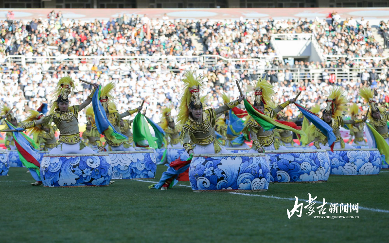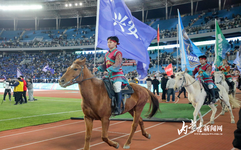 赛前,呼和浩特体育场歌声飞扬。《为内蒙古加油》率先点燃全场激情,蒙超联赛主题曲《咱们的歌》余音未落,《蒙超力量》的铿锵节奏已让赛季点滴重现眼前。12个盟市球员代表齐声唱响《让我们一起为你加油》,安代舞刚劲,战鼓震山河——这场万众瞩目的决赛拉开战幕,知名主持人黄健翔现身,为球迷带来激情四射、专业独到的解说。