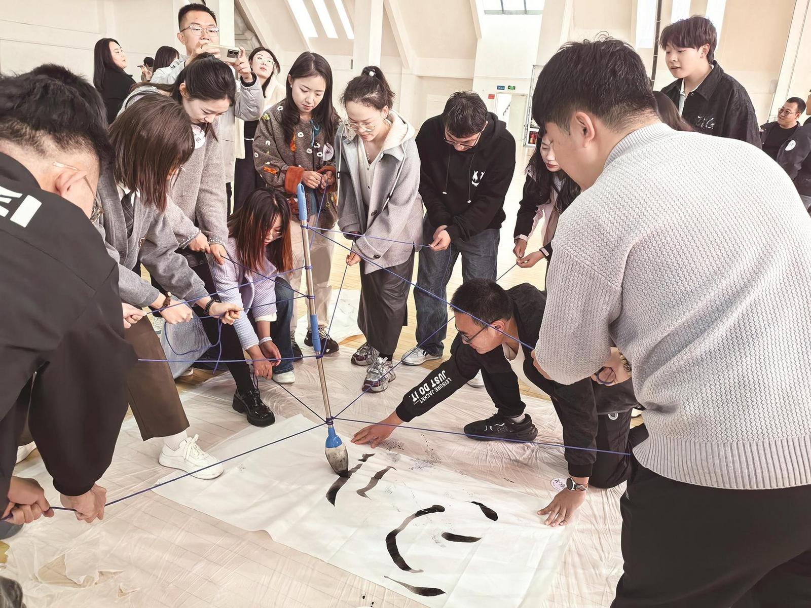 “一圈到底”团体游戏让大家的亲密度大幅提升,现场欢声笑语不断。“毛笔写字”游戏将整个活动的氛围推到了高潮,十几名青年相互协作,一起操控巨型毛笔在纸上写下“心动”二字。活动尾声,青年们主动交换了联系方式。这不仅为未来的进一步交流埋下了契机,更让这场温馨的交友活动多了一份美好期待。