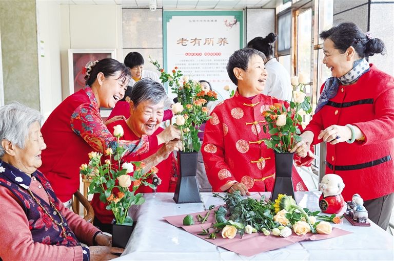 10月27日,工作人员与志愿者一同陪伴老人们插花。当日,呼和浩特市民政局联合玉泉区民政局开展的“爱心敬老 情暖重阳”主题活动在金河夕阳红康乐园举行,现场开展了制作重阳糕、体验插花等活动,在欢声笑语中弘扬尊老、敬老、爱老的中华传统美德。草原云·内蒙古新闻网记者 王磊 摄