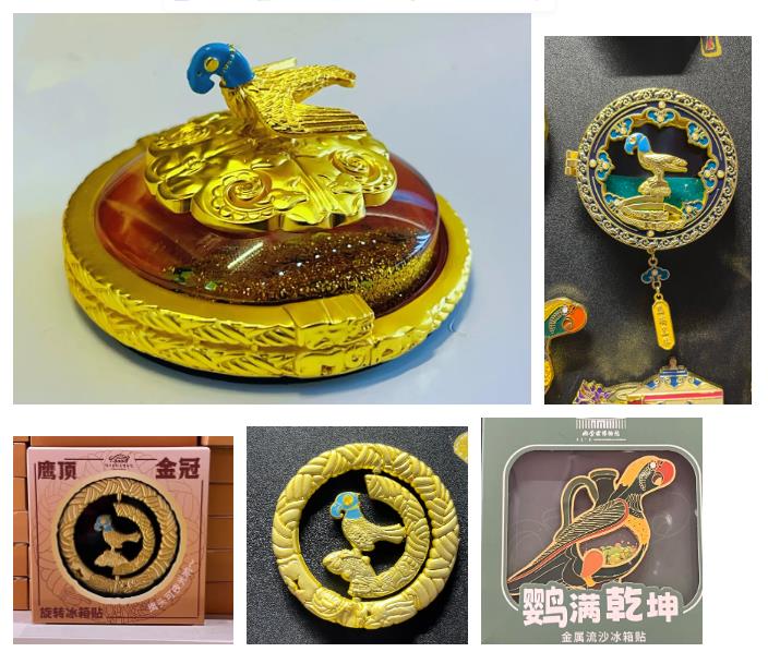 一旁的点翠凤冠立体金属冰箱贴前,几位年轻女孩正低声赞叹,“你看这立体纹路,连凤冠上的细小装饰都还原了,摸起来质感超棒,简直是把博物馆里的文物‘缩小’带回家。”汉·镶宝石金冠饰金属冰箱贴则吸引了不少历史爱好者驻足,来自山西的游客张阿姨戴着老花镜仔细端详,“我专门对比了博物院里的文物原型,金饰的光泽和宝石的点缀都很逼真,买回去既能收藏又能给孙辈讲解汉代历史。”