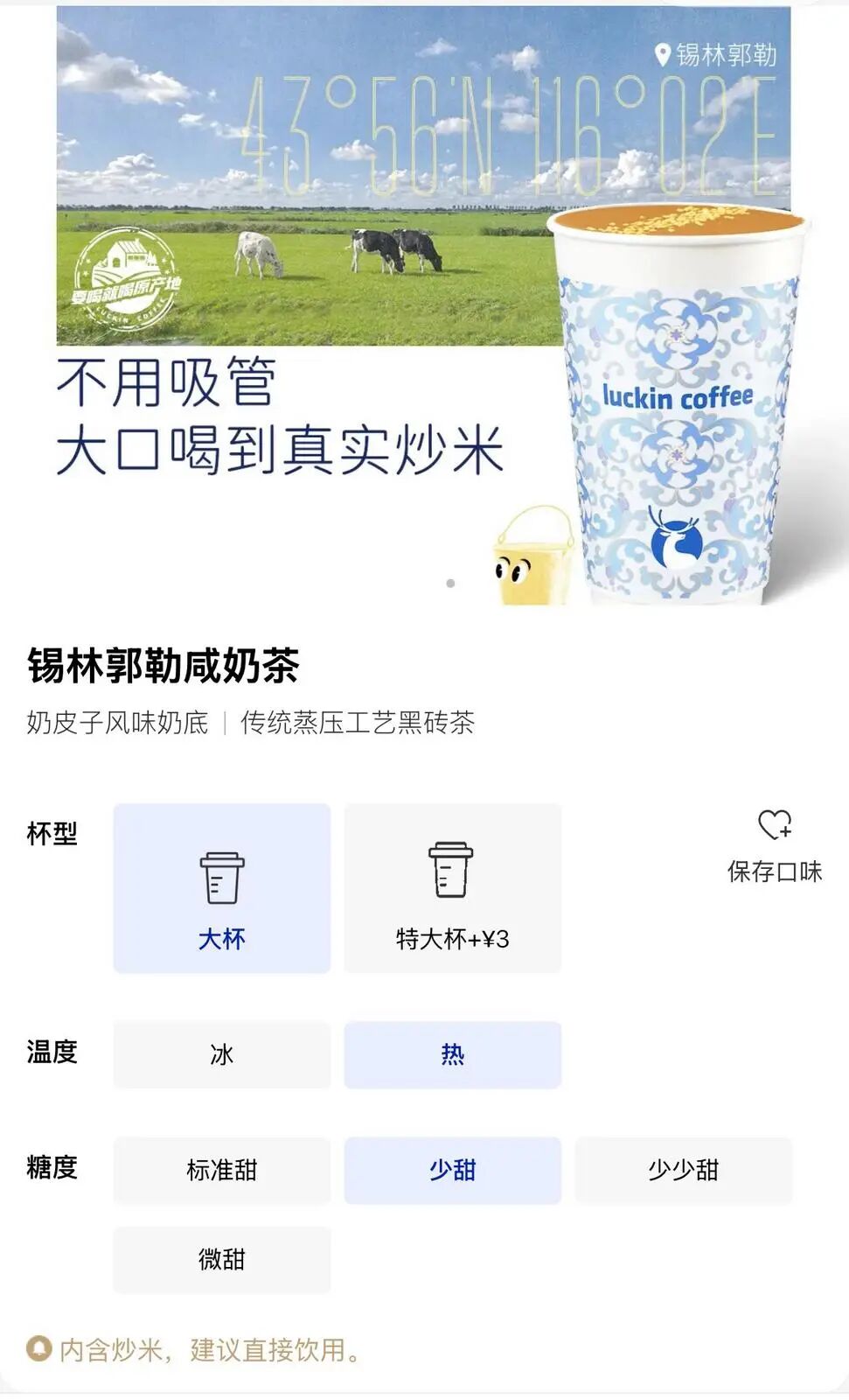 瑞幸如今复刻这份地道:砖茶慢熬出醇厚茶汤,注入纯牛奶反复搅扬,放一勺炒米还原本味,同时为了符合大众多元化的口味,还设置了四种糖度可选。网友测评直呼“咸香绵长,没有甜腻感”,而锡盟游子则留言“一口梦回锡林郭勒草原”。
