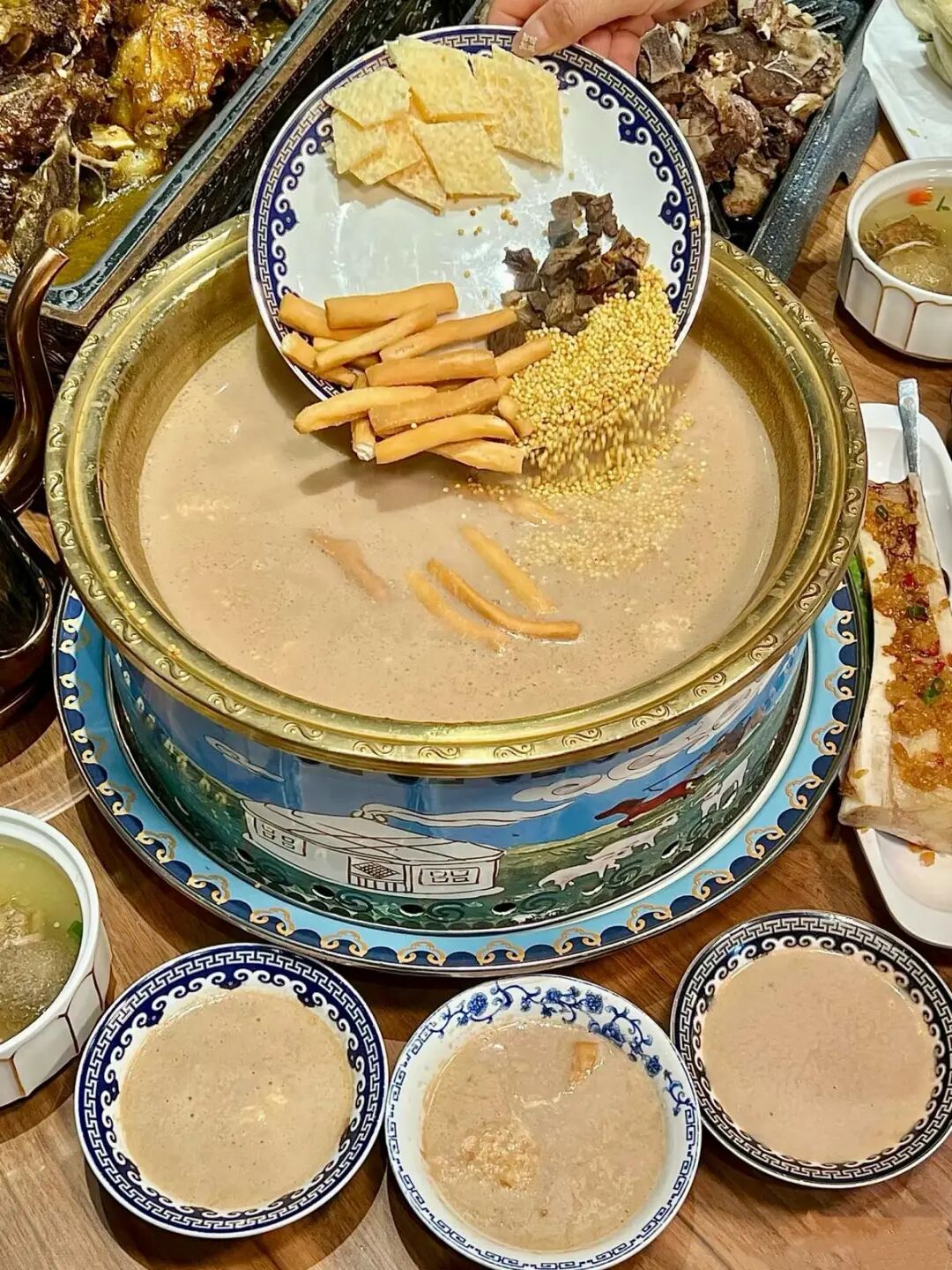 奶茶早已刻进锡盟人的日常,它是“宁可一日无食,不可一日无茶”的生命之饮,对本地人而言,清晨熬奶茶是一天的开端——将青砖茶包入锅,将牛奶、盐倒入沸腾茶汤,反复扬勺让茶奶交融,香气能飘满整个草原。喝时配奶豆腐、炒米、奶皮子、牛肉干,这样才算完整。