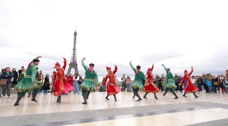 在法国巴黎埃菲尔铁塔前夏约宫广场,来自中国阿拉善的宣介团,用一场融合蒙古族华服走秀与乌兰牧骑快闪的表演,让北疆文化的风情绽放在塞纳河畔,吸引了法国以及来自世界各地的游客驻足观看,喝彩声不断。大家纷纷表示,“这服装太酷了!演奏听出了万马奔腾的感觉。”“真想去阿拉善巴丹吉林沙漠看一看,太壮观了。”“今天的舞蹈、歌声很美,意犹未尽。”