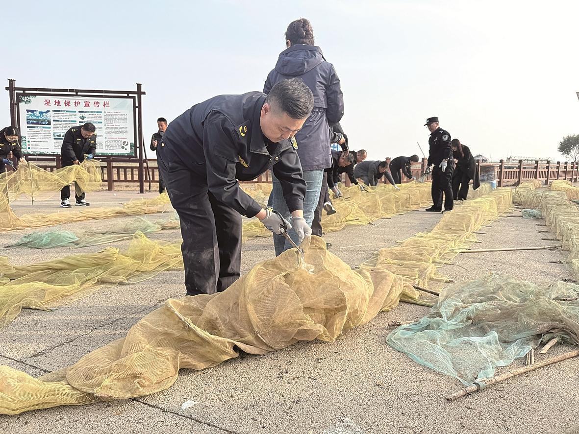 日前,2025年包头市集中销毁违法捕捞渔具行动在九原区萨如拉景观大道观景台举行。