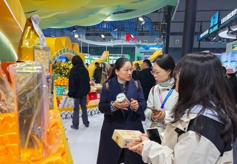 在人头攒动的阿拉善展区,沙漠特色产品与科技成果的融合展示成为最大亮点。阿胶肉苁蓉原浆、肉苁蓉压片糖果等深加工产品,彰显着阿拉善对沙生植物资源的高值化开发;沙漠银耳、五宝茶等特色农产品,传递着戈壁绿洲的生态馈赠;口感醇厚的驼酸奶,则让各地客商和观众直观感受到阿拉善特色畜牧业的发展成果。展区内,企业通过实物陈列、专人讲解、免费品鉴等多元形式,全方位展现产品的研发理念与品质优势,迅速吸引大批客商与观众驻足围观。