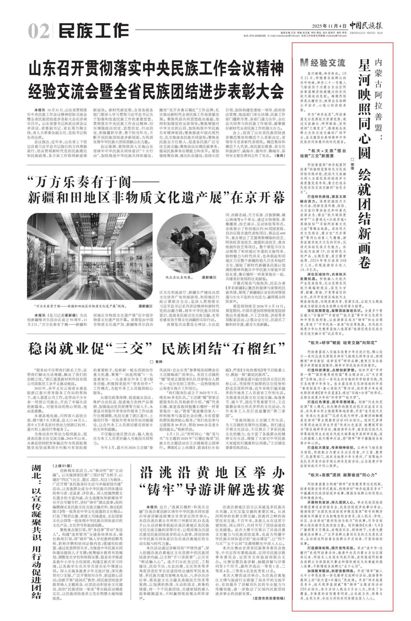 2025年11月4日,《中国民族报》第2版刊发题为《内蒙古阿拉善盟:星河映照同心圆 绘就团结新画卷》的文章,报道了伴随着各族群众的欢呼呐喊,神舟二十一号载人飞船在位于内蒙古自治区阿拉善盟额济纳旗境内的东风航天城成功发射。璀璨烈焰照亮北疆夜空,映照出各族群众手拉手、心连心的团结身影。