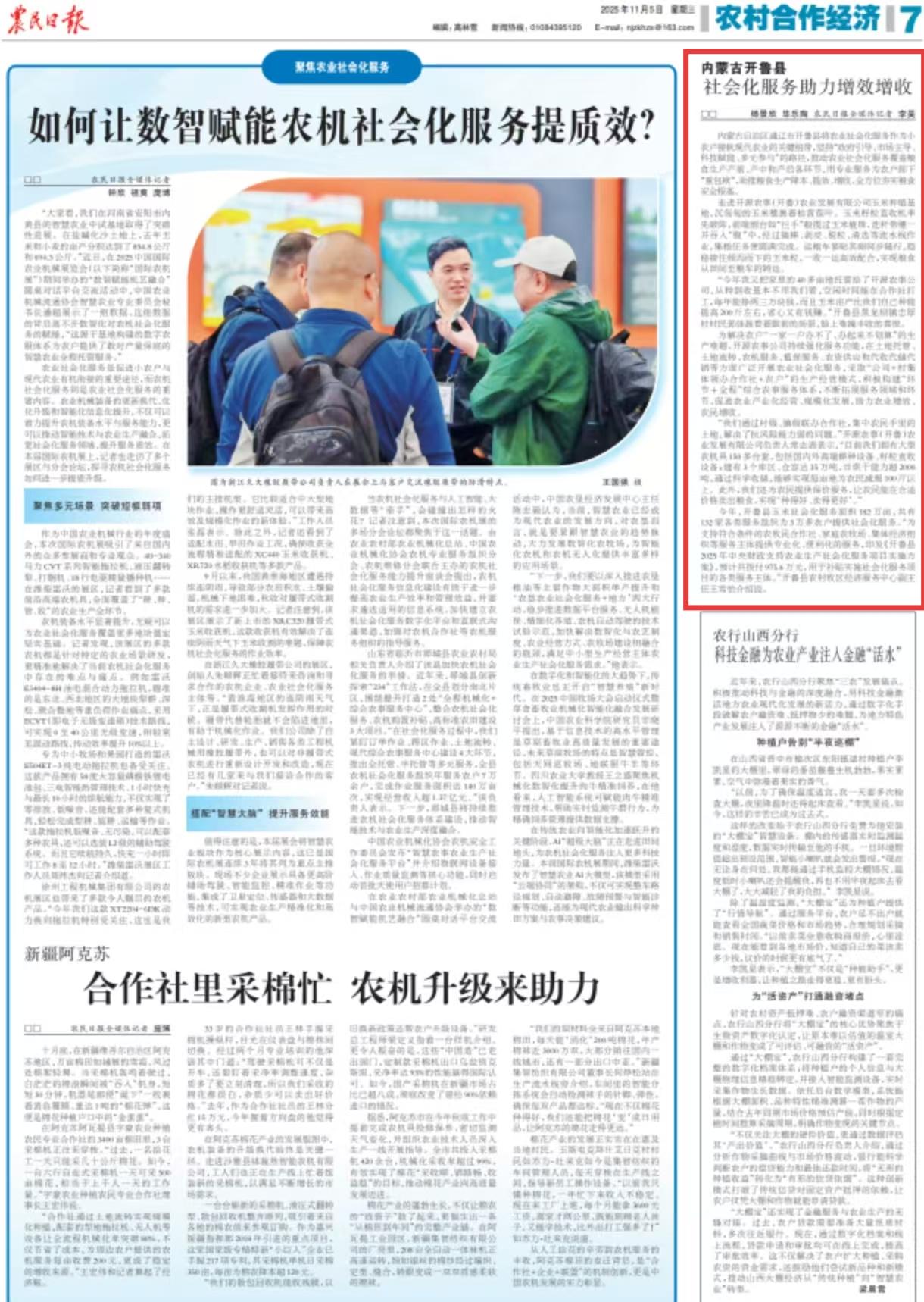 2025年11月5日,《农民日报》第7版刊发题为《内蒙古开鲁县:社会化服务助力增效增收》的文章,报道了今年以来,内蒙古开鲁县玉米社会化服务面积182万亩,共有132家各类服务组织为3万多农户提供社会化服务。