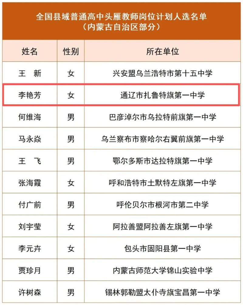 近日,教育部办公厅印发《关于公布全国县域普通高中头雁教师岗位计划人选的通知》,确定首批全国县域普通高中头雁教师岗位计划入选教师600人,其中通辽1位教师入选,一起来看名单——