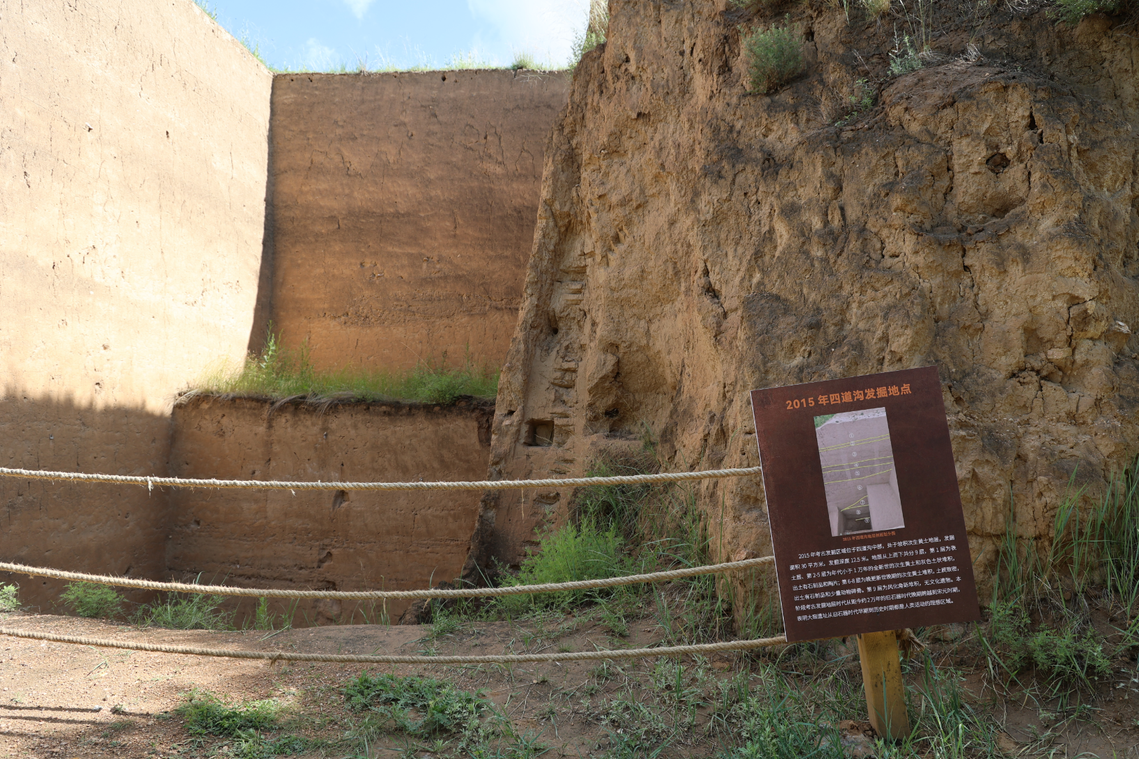 沿着史前文化主题步道从“无字天书”向东行走近百米,到达四道沟东区第二个剖面点,即2015年考古发掘的剖面点,同样,这个剖面点的地层关系也很清晰。