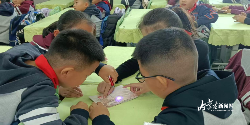 “大家仔细看,见证奇迹的时刻到了!”民警张秉毅拿起紫外线手电,对准手中的护照内页。随着光束移动,长城的蜿蜒轮廓、上海浦东的摩天大楼等标志性景观逐一显现,课堂瞬间响起此起彼伏的“哇”声。“我去过上海!这是东方明珠旁边的楼!”“我在课本里见过长城,原来护照里也有!”孩子们伸长脖子,争先恐后地指认着熟悉的地标,小脸上满是兴奋。当讲到护照封面上的国徽和内页“中华人民共和国外交部请各国军政机关对持照人予以通行的便利和必要的协助”这句话时,张秉毅放慢语速:“这枚国徽代表着祖国,这句话意味着无论你们走到世界哪个角落,祖国都是你们最坚实的后盾。”原本叽叽喳喳的课堂渐渐安静下来,孩子们不约而同地挺直腰板,小手轻轻抚摸着展示用的护照样本,眼神里多了几分庄重。