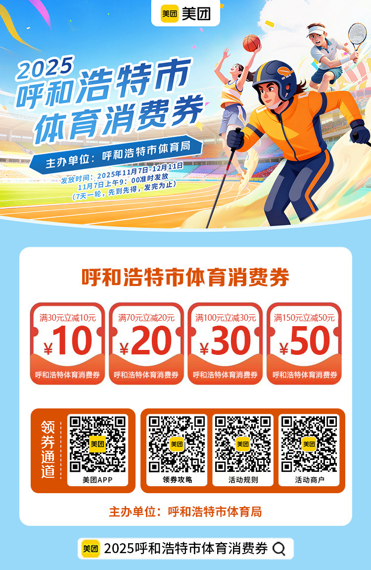 本网讯(草原云·内蒙古新闻网首席记者 牛天甲) 记者从呼和浩特市体育局了解到,2025呼和浩特市体育消费券发放活动11月7日开始,其中体育场馆消费券仅限实时定位在呼和浩特市的消费用户领取,体育门票消费券全国消费用户均可领取。